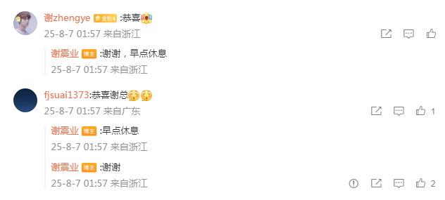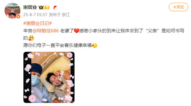 谢震业也是通过社媒写道:“辛苦老婆了,感谢小家伙的到来,让我体会到了“父亲”是如何书写的,愿你们母子一直平安喜乐、健康幸福。”